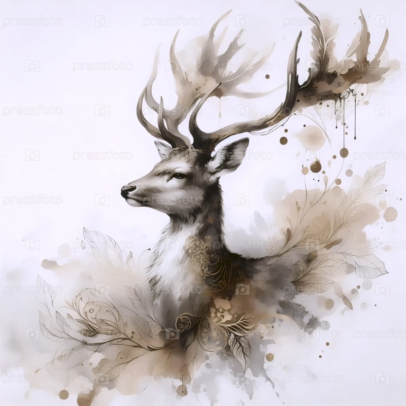 Величественный олень с рогами акварельная печать, Ai generated image