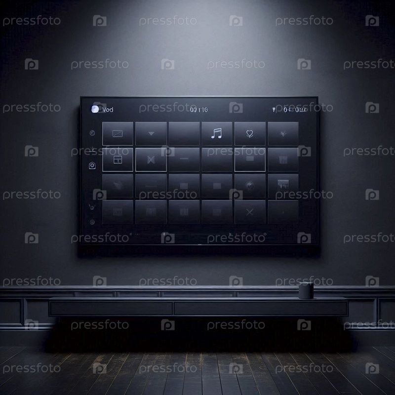 Макет большого телевизионного экрана, отображающий чистую и пустую сетку медиабиблиотеки на темной стене, Ai generated image