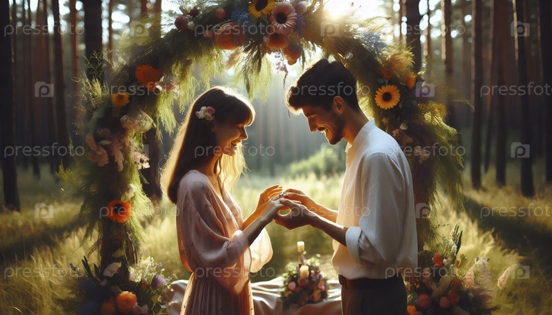 Интимная церемония микро-свадьбы на лесном поле, Ai generated image