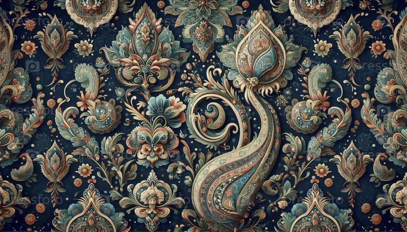 A Mughal style Paisley pattern seamless design, Ai generated image В могольском стиле бесшовный дизайн узора Пейсли, созданного изображением