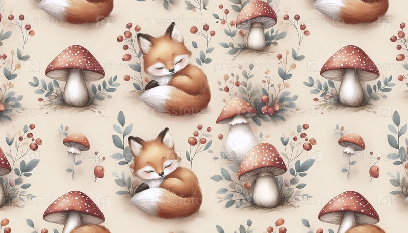 Милый печатный акварельный рисунок лисы для детской ткани без швов, Ai generated image