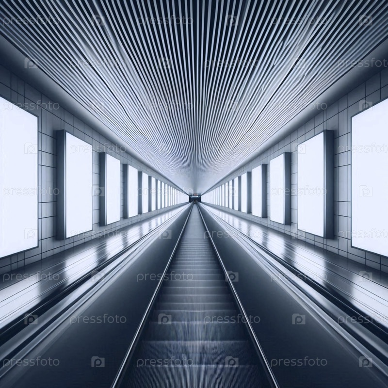 Вертикальный последовательный макет панели проходит рядом с пустым движущимся эскалатором на современной станции метро, Ai generated image