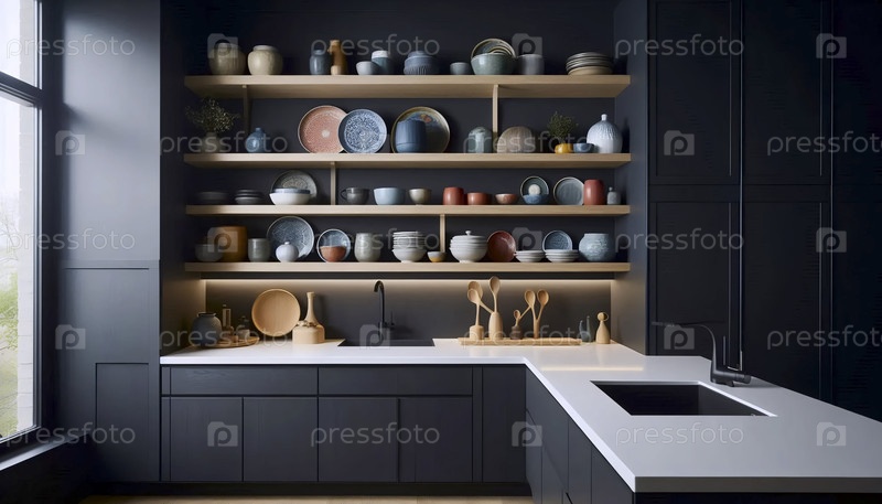 Голубая кухня из графита с дубовыми открытыми полками, Ai generated image