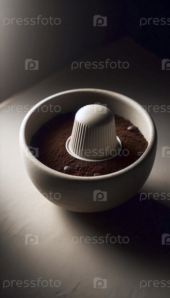 Мокет одной пустой капсулы кофе, сделанный из биоразлагаемого материала и размещенный на кофейной кастрюле в керамической чашке, Ai generated image