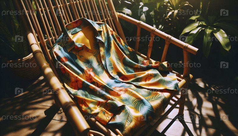 Макет рубашки с коротким рукавом в печатном шелке, расстегнутой и положенной над бамбуковым стулом, Ай создал изображение