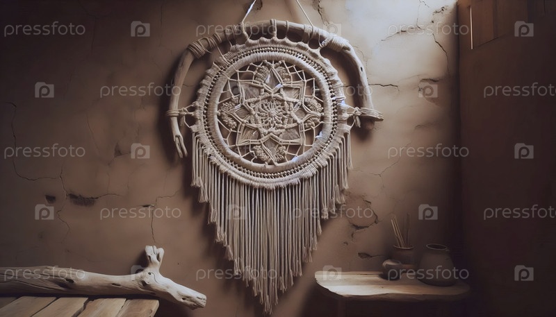 Стенная иллюстрация, сделанная из натурального макрама и дрифтового дерева, Ai generated image