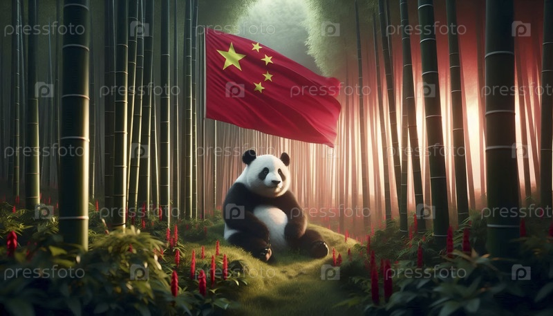 Китайский флаг с гигантской пандой в бамбуковом лесу, Ai generated image