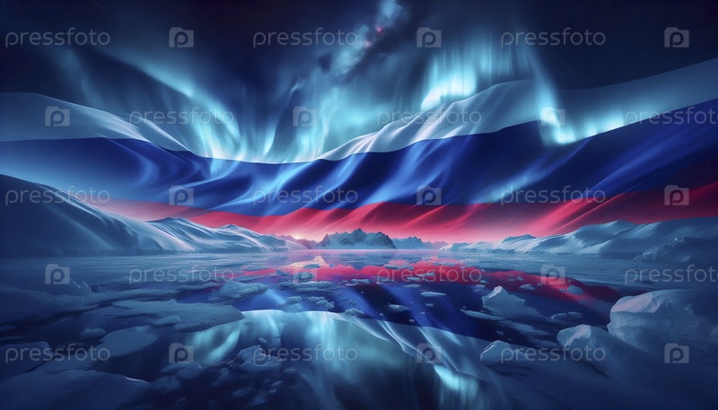 Российский флаг в северном свете над арктической тундрой, Ai generated image
