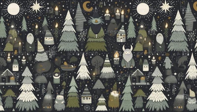 Бесшовный образец скандинавского сказочного леса, Ai generated image
