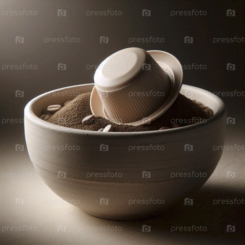 Мокет одной пустой капсулы кофе, сделанный из биоразлагаемого материала и размещенный на кофейной кастрюле в керамической чашке, Ai generated image