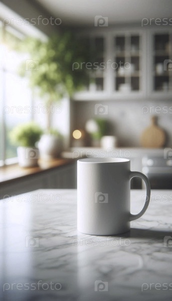 Простой керамический макет кружки на мраморном кухонном столешнице, с нефокусированным зеленым, Ai generated image
