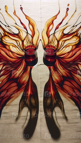 Цветная абстрактная крупнометражная фотография сливающихся теней из двух бокалов вина, Ai generated image