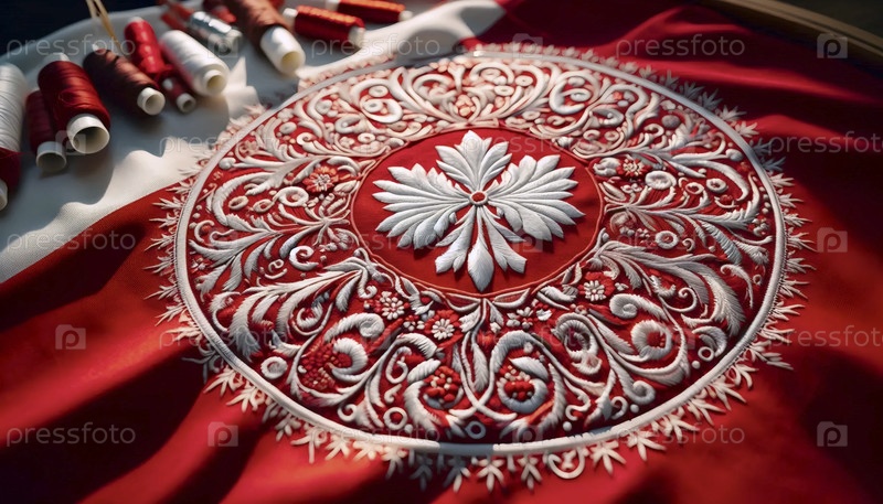 Польский флаг в традиционной народной вышивке, Ai generated image