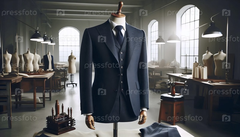 Классический макет трехкомпонентного костюма из военно-морской шерсти, расположенный на манекену портного, Ai generated image