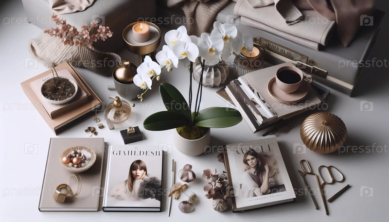Орхидея с журналами и книгами, Ai generated image