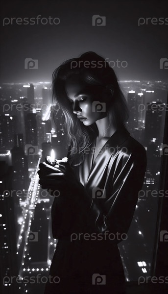 Женщина зажигает сигарету на балконе небоскреба, Ai generated image