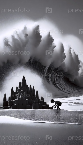 Ребенок, строящий крепость песчаного замка против надвигающегося прилива, Ai generated image