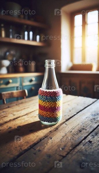 Мокет прозрачной стеклянной бутылки с молоком, расположенный в красочном трикотажном многоразовом рукаве на деревянном кухонном столе, Ai generated image