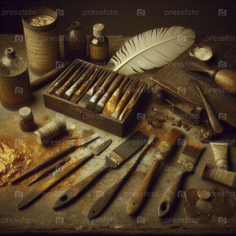 Таблица для одежды ангелов: белая краска, золотая пыль, флакон забвения, Ai generated image