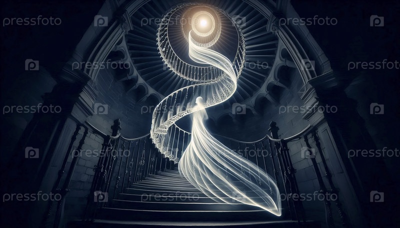 Фотография с длинной экспозицией фигуры, поднимающейся по спиральной лестнице, Ai generated image