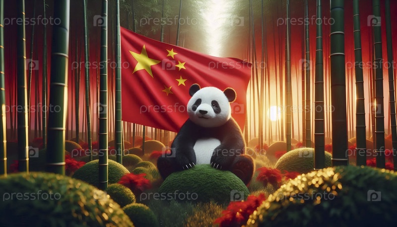 Китайский флаг с гигантской пандой в бамбуковом лесу, Ai generated image