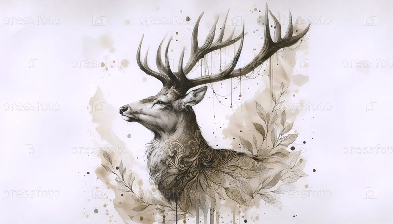 Величественный олень с рогами акварельная печать, Ai generated image