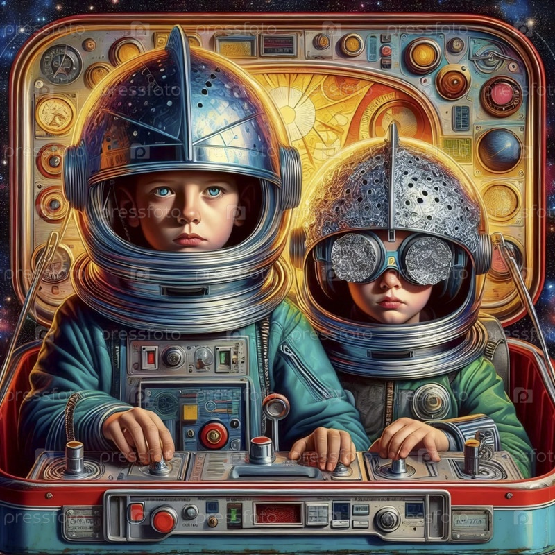 Научно-фантастический плакат детей в картонном космическом корабле, Ai generated image