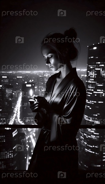 Женщина зажигает сигарету на балконе небоскреба, Ai generated image