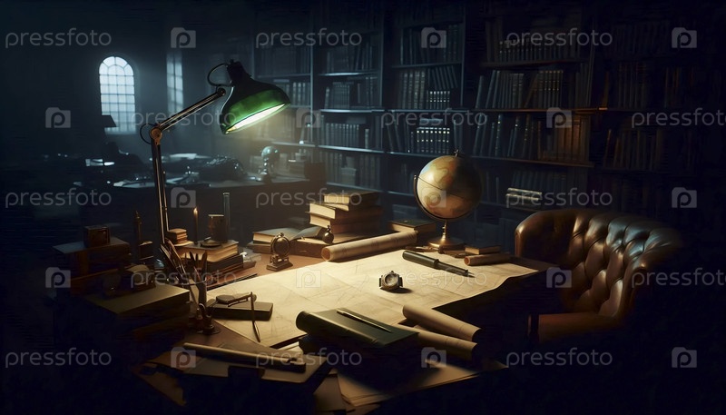 Более широкий снимок слабо освещенного кабинета с часами в фокусе, созданный изображением Ai
