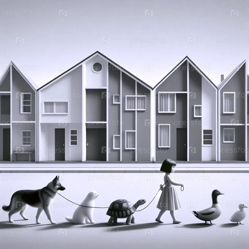 Иллюстрация середины века ребенка, ведущего шествие животных, Ai generated image