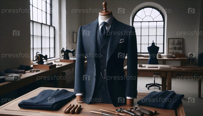 Классический макет трехкомпонентного костюма из военно-морской шерсти, расположенный на манекену портного, Ai generated image