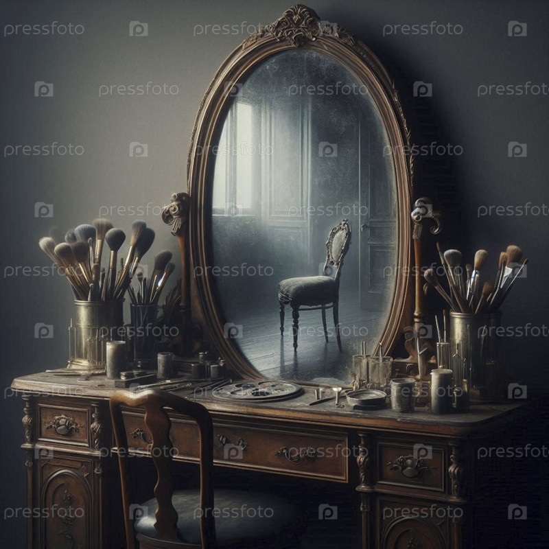 Более широкий снимок, включающий пыльное зеркало, отражающее пустой стул, Ai generated image