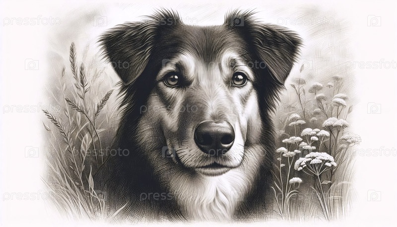 A loyal dog ink drawing art print, Ai generated image Искусственный печатный рисунок с чернилами верной собаки