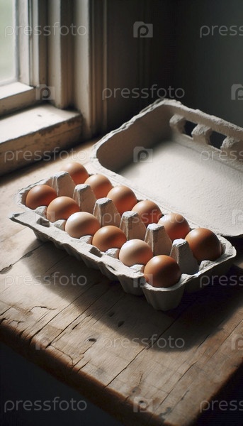 Пустой, сформированный макет картона из мягких яиц, открытый на деревенском кухонном столе, Ai generated image