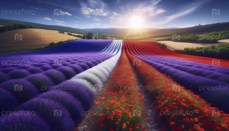 Французский флаг на полях лаванды в Провансе, Ai generated image