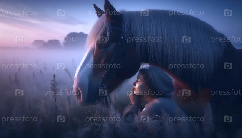 Женщина шепчет лошади на рассвете, Ай создал изображение