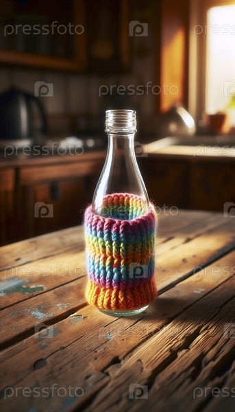 Мокет прозрачной стеклянной бутылки с молоком, расположенный в красочном трикотажном многоразовом рукаве на деревянном кухонном столе, Ai generated image
