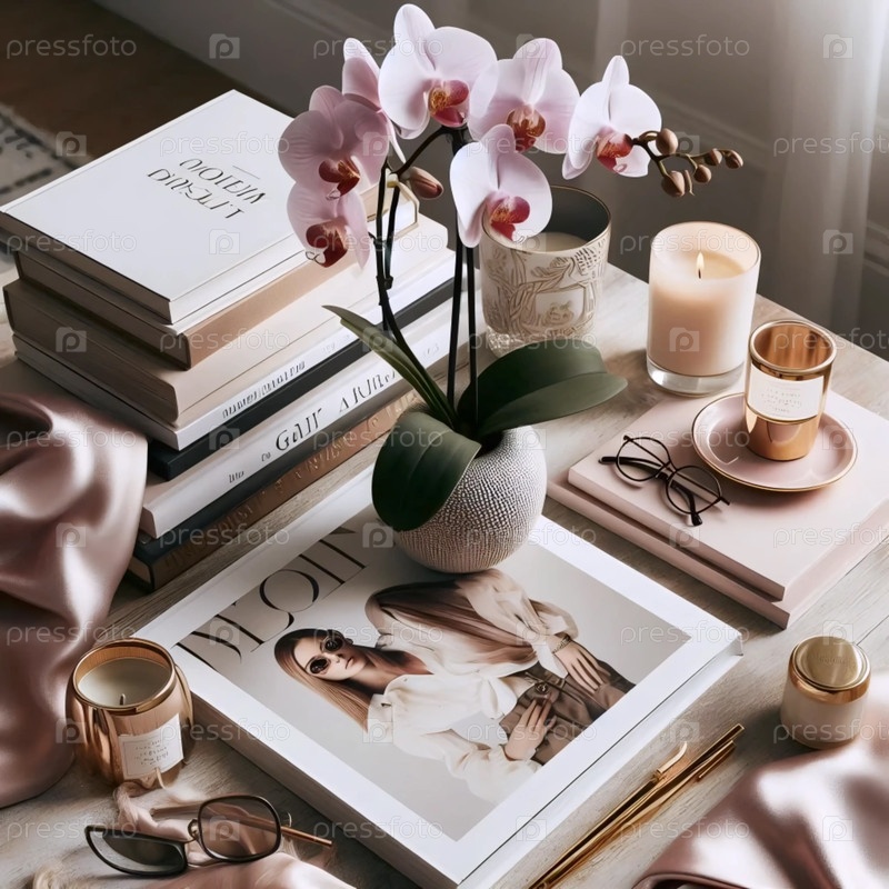 Орхидея с журналами и книгами, Ai generated image