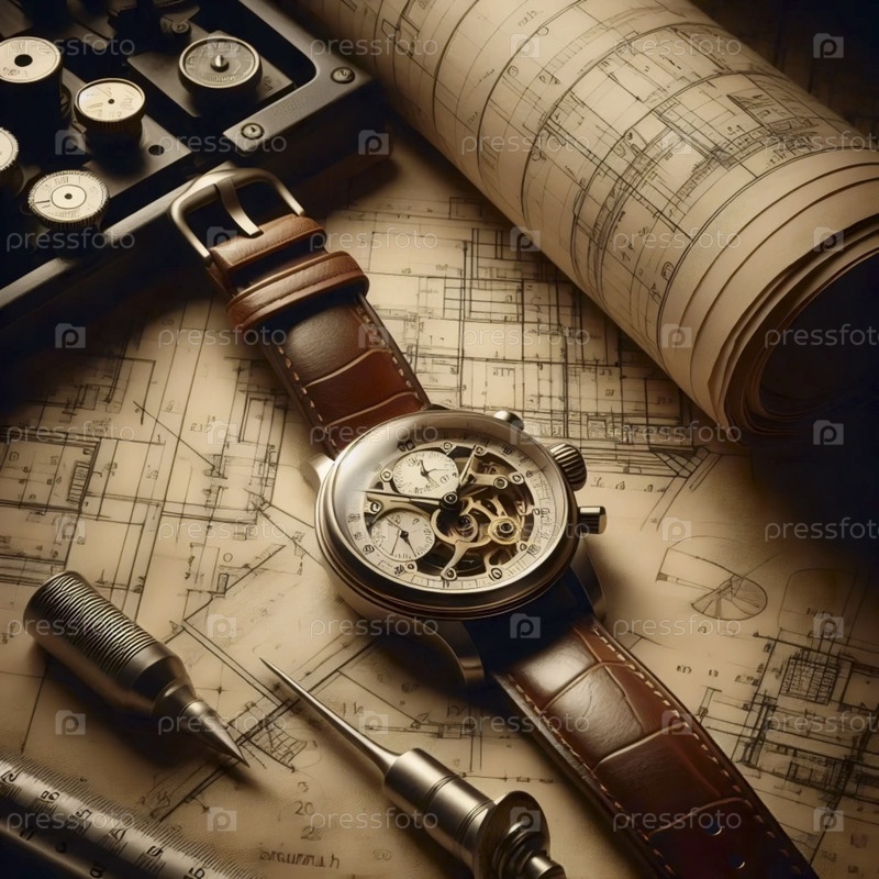 Удаленные наручные часы, лежащие на чертежах, Ai generated image