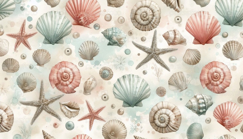 Водяной акварель прибрежных летних раковин морской рисунок, Ai generated image