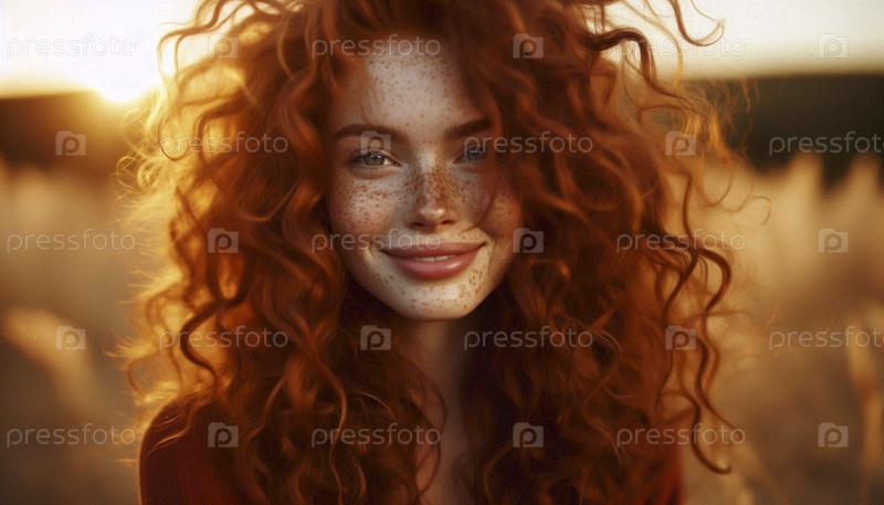 Портрет рыжеволосой с веснушками в золотое время, Ai generated image