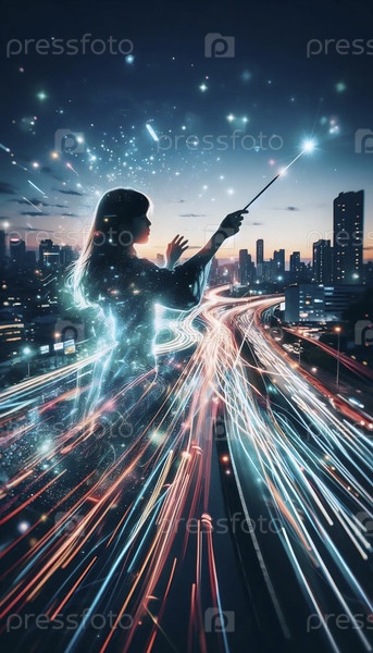 Девушка дирижирует симфонией городских огней с помощью искры, Ai generated image