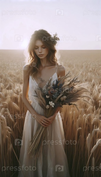 Невеста с букетом диких цветов в поле, Ai generated image