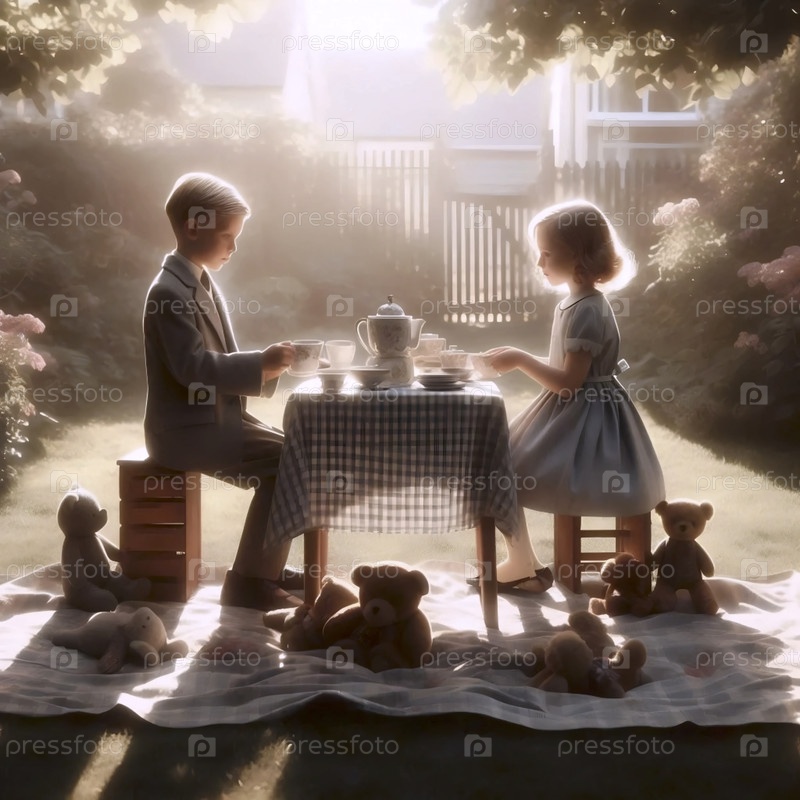 Очаровательный плакат чайной вечеринки с плюшевым медведем на заднем дворе, Ai generated image
