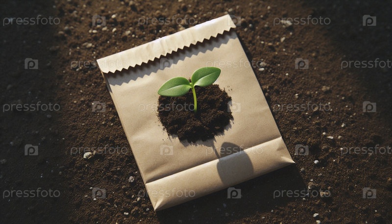 Макет плоского, переработанного бумажного торгового пакета с простым саженцем, растущим в углу на почвенном поле, Ai создал изображение