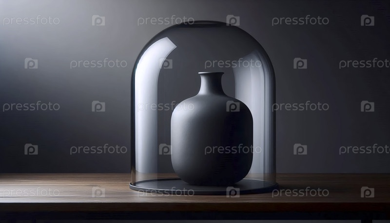 Матовый черный керамический макет вазы под большой стеклянной колокольницей на темном пьедестале из окрашенного дуба, Ai generated image