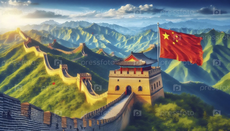 Китайский флаг в архитектуре Великой стены, Ai generated image A