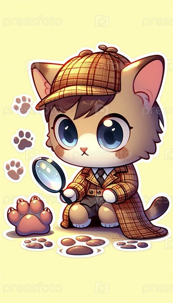 Милый мультфильмовый детективный кот, изучающий подсказки, Ai generated image