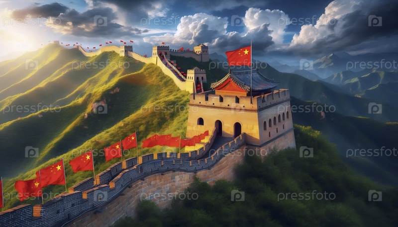 Китайский флаг в архитектуре Великой стены, Ai generated image A