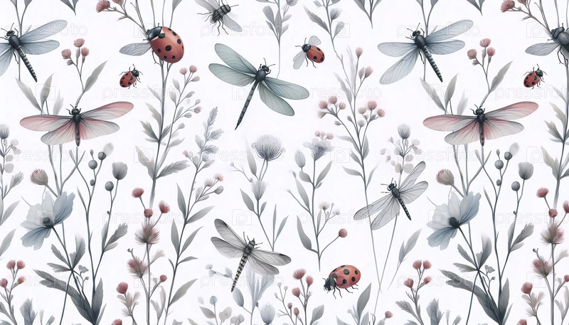 Нежный акварельный цвет насекомых ботанический бесшовный шаблон, Ai generated image